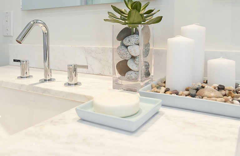 As the main attraction, marble countertops are the number one option in the world today for its aesthetically pleasing, pristine, and timeless look. Marble creates the most high-end vision for any bathroom. However, like granite, it is porous and needs to be taken extra care of daily. Consistent sealing will prevent etching, staining, and scratching.
